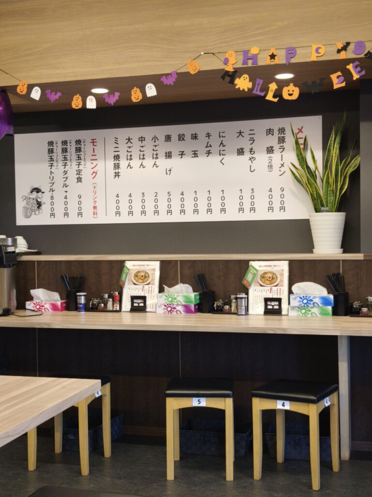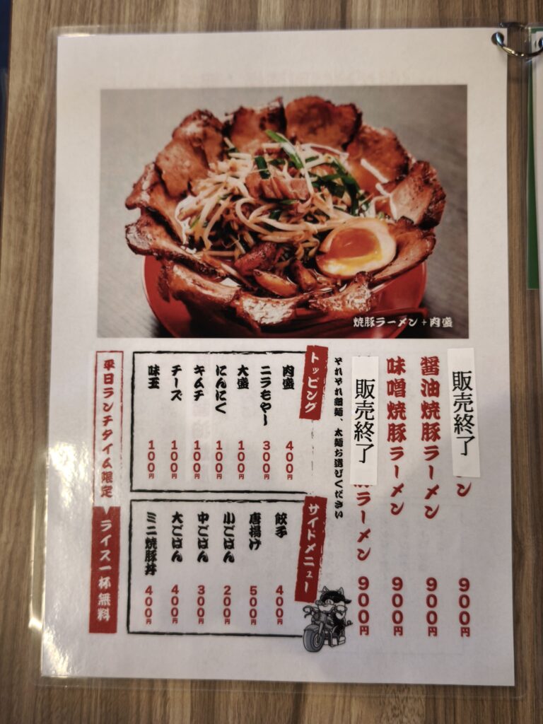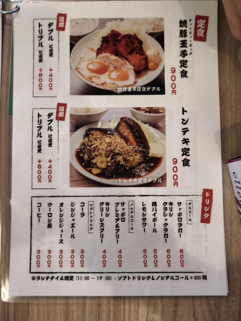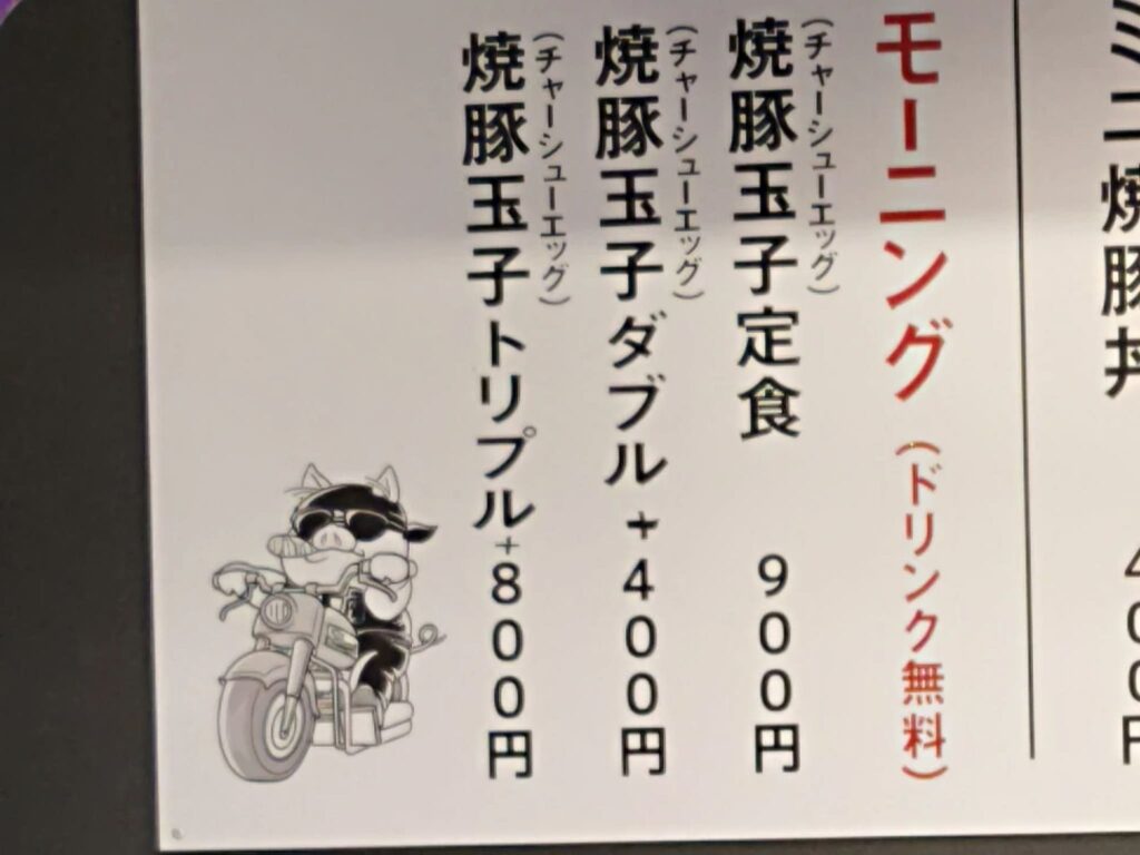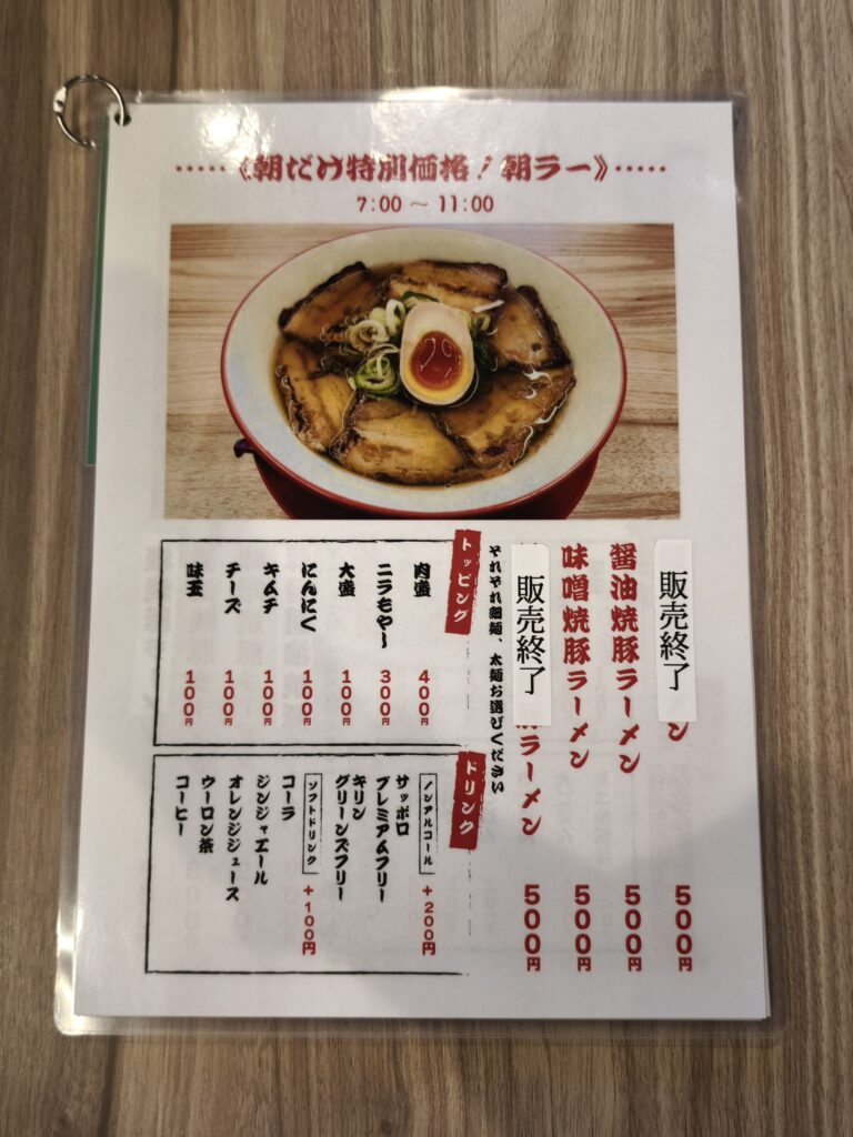 モーニングメニューは「醤油」と「味噌」の味と「細麺」、「太麺」の2種類の麺の好みから選べるラーメンと「焼豚玉子(チャーシューエッグ)定食」の3種類です。焼き豚卵定食は11:00まで無料でドリンクがつきますので、実質モーニングとも言えそうです。