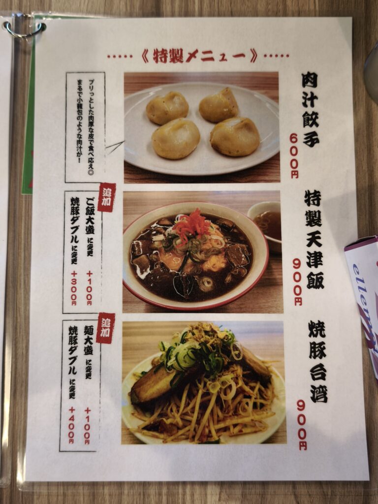 肉汁餃子や焼豚台湾が気になります。