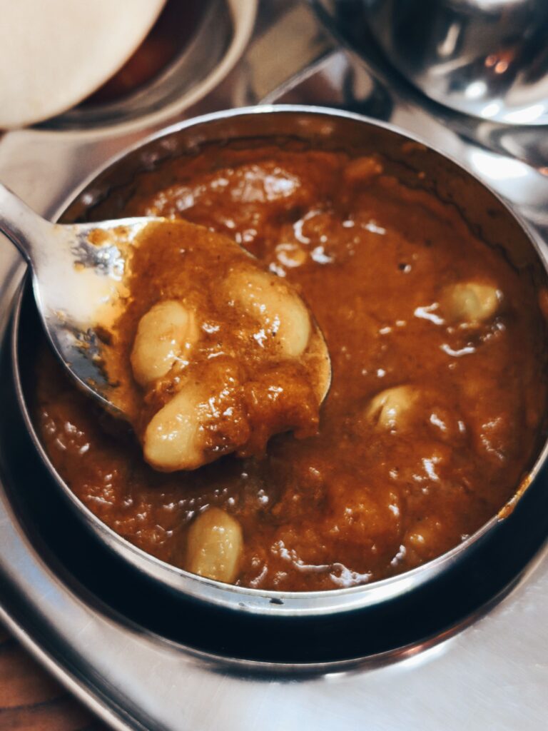 チーズナンについてきたカレーです。枝豆は煮込まれすぎず、しっかり枝豆らしい食感と味があって美味しかったです。