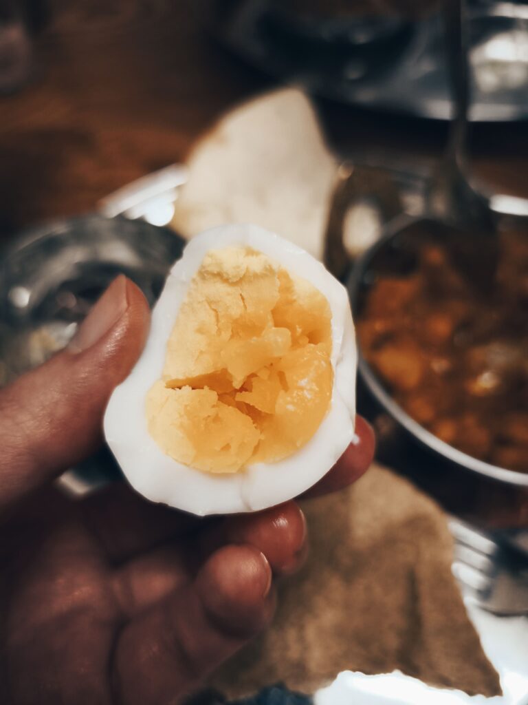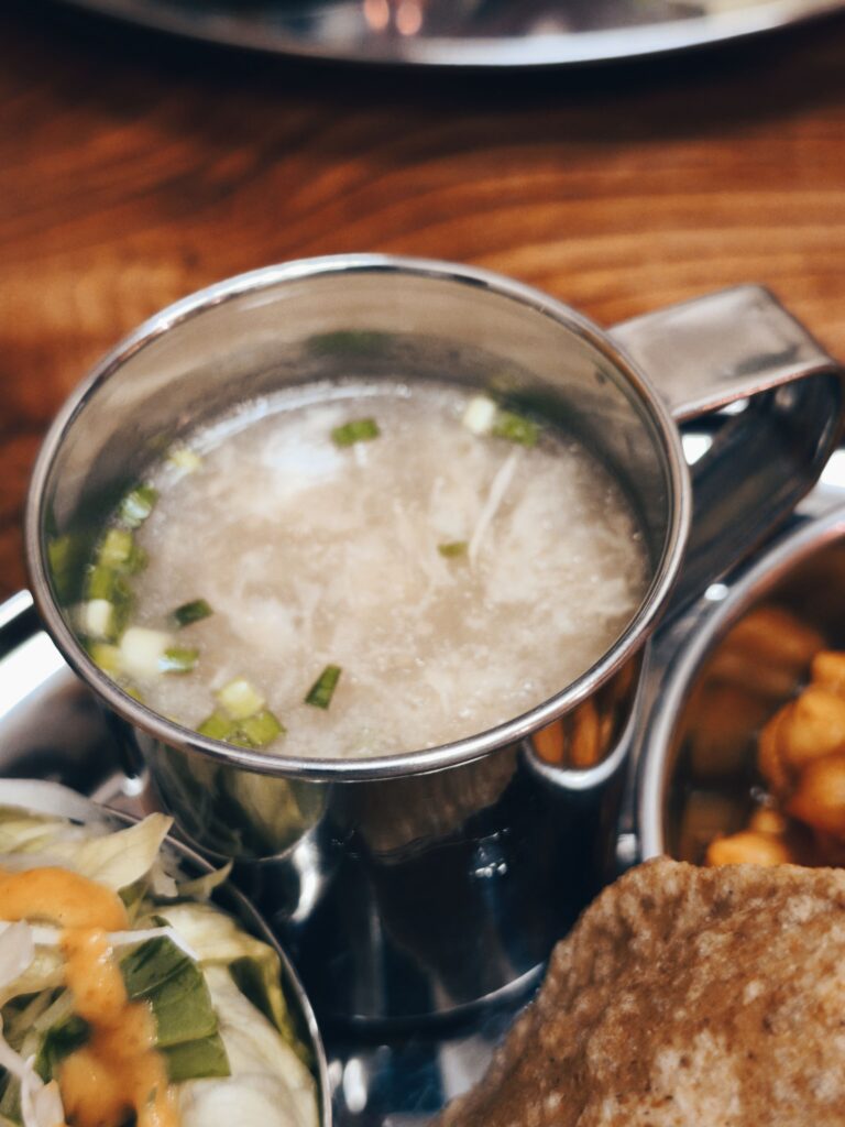 ニンニクとスパイスが効いた卵と玉ねぎ、ネギのスープ。