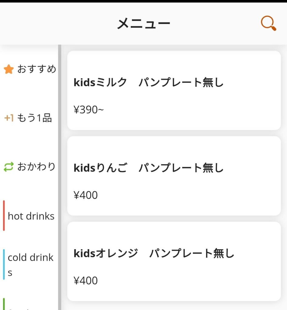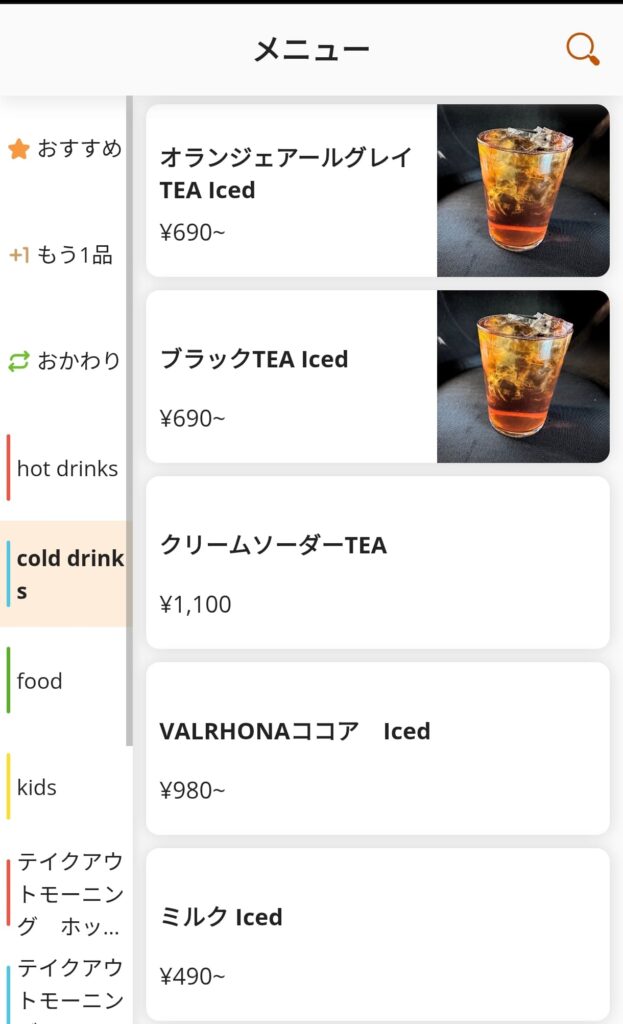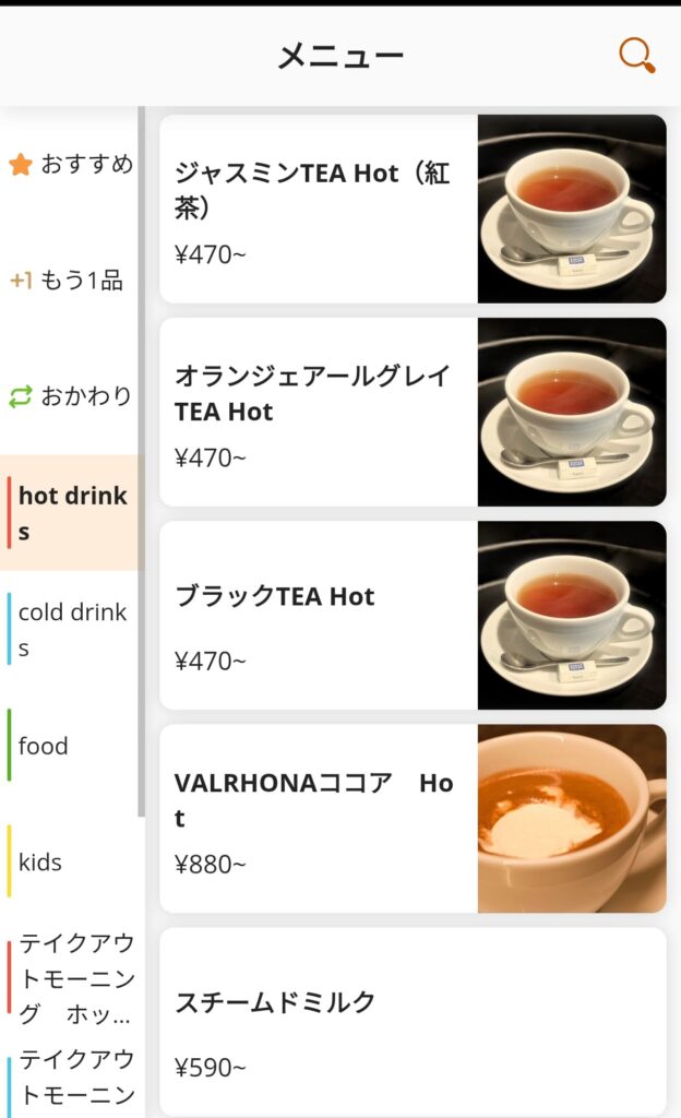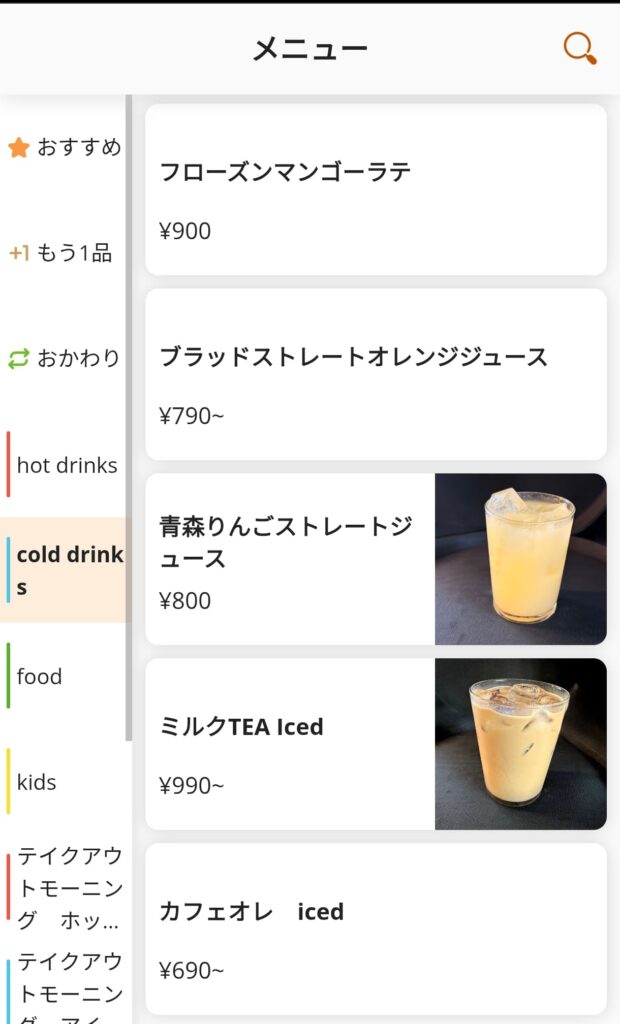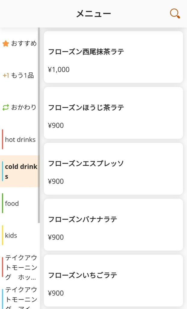 席に着いたらスマートフォンでメニューを見て注文するスタイルなので、ドリンクと一緒にメニューから選んで注文します。