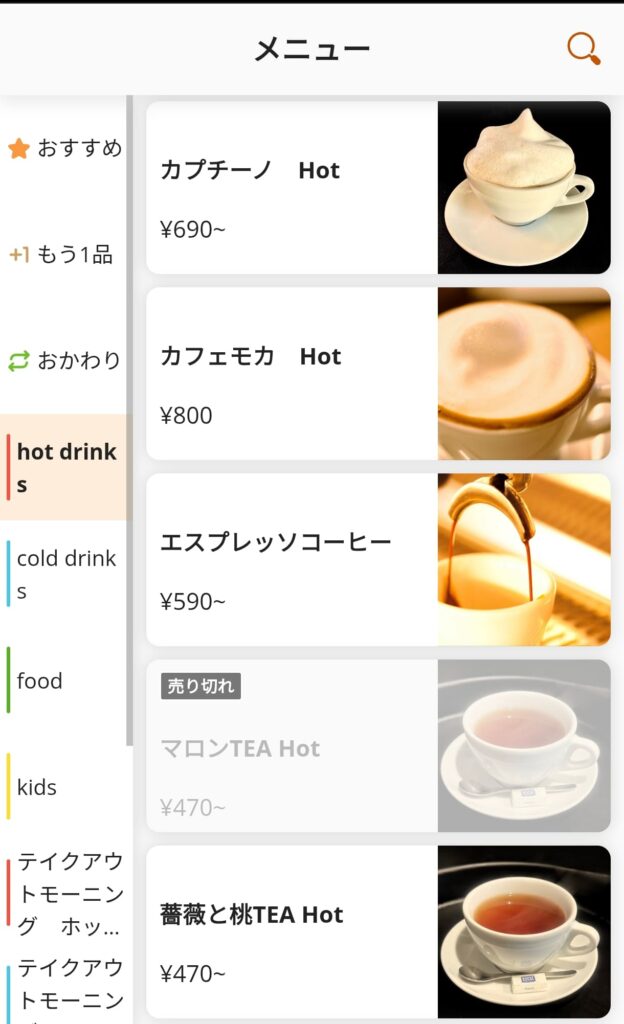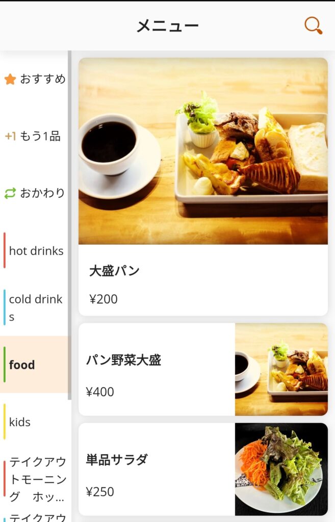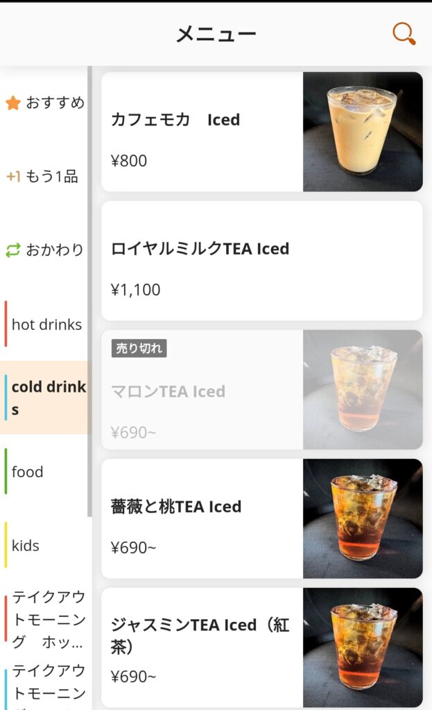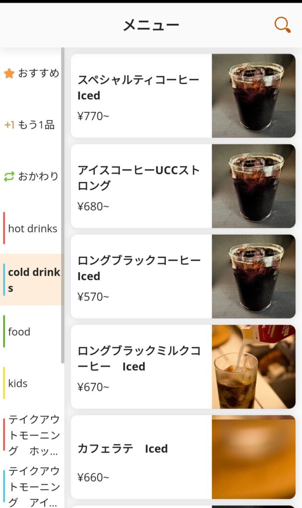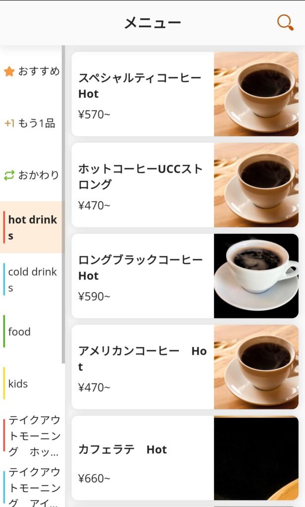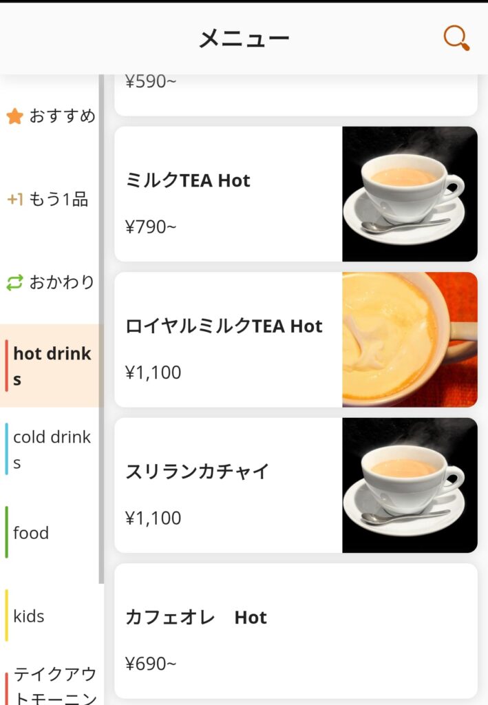 席に着いたらスマートフォンでメニューを見て注文するスタイルなので、ドリンクと一緒にメニューから選んで注文します。