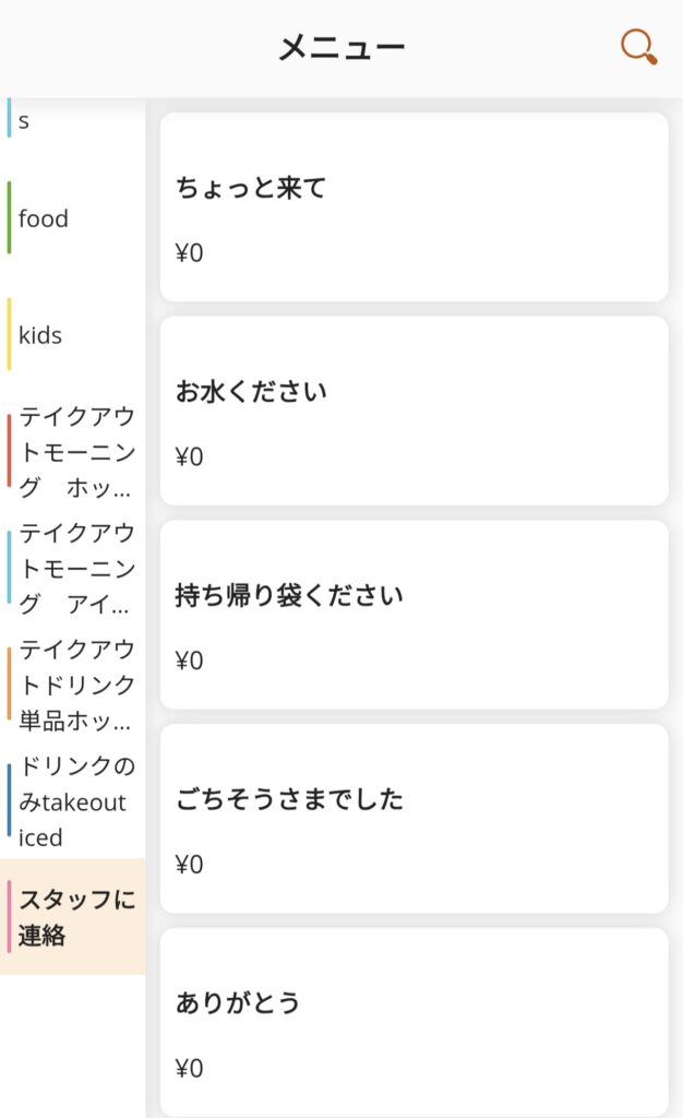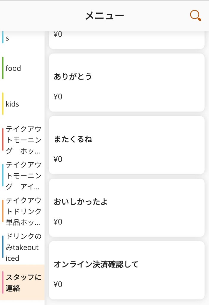 スマホから注文するメニューには「スタッフに連絡」という項目があります。ぜひ帰りがけに「ごちそうさま」「ありがとう」「おいしかったよ」などを伝えられるので、押してもらえたらなと思います。